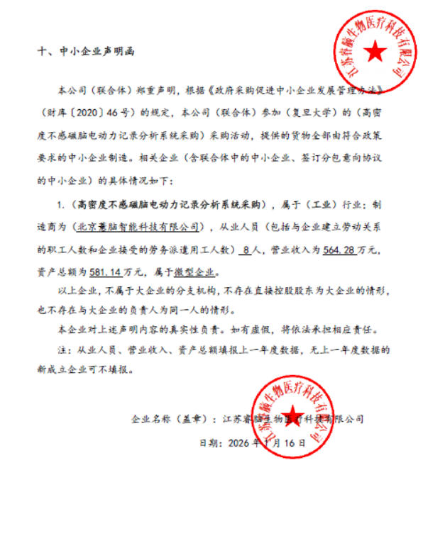 1 | 江苏睿脑生物医疗科技有限公司 | 高密度不感磁脑电动力记录分析系统 | 北京薏脑智能科技有限公司 | Neurolab NME-72 | 659,000.00 | 1套 | 659,000.00 |