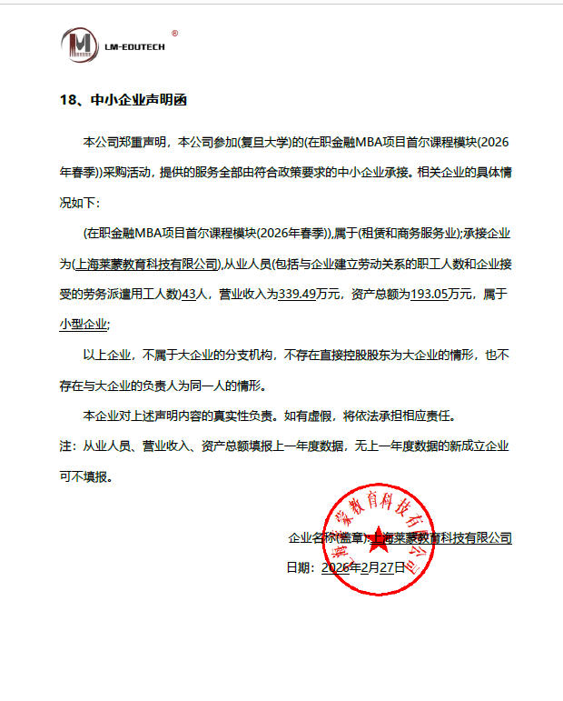 1 | 上海莱蒙教育科技有限公司 | 复旦大学在职金融MBA项目首尔课程模块(2026年春季) | 首尔课程模块作为在职金融MBA项目培养方案中的必修课,依托全方位的沉浸式学习,助力开拓学生全球化视野。本次课程在韩国首尔开展,期望通过名校课程、企业参访、文化交流等模块化学习带领学生深入理解全球宏观经济及金融政策;了解当地实体经济与制造业;探究金融科技如何通过云计算、机器学习、区块链和数据科学对金融业务产生颠覆式创新。 | 满足采购文件规定的要求 | 2026年4月30日前完成(具体以采购人最终确定时间为准) |